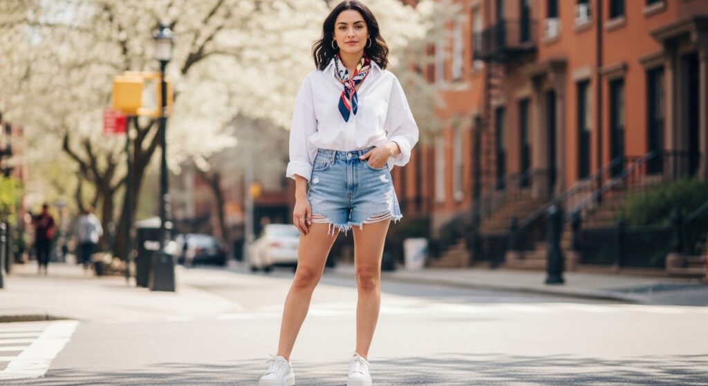 For warmer April days, go for denim shorts paired with an oversized shirt. This outfit is comfortable, breathable, and very trendy.
