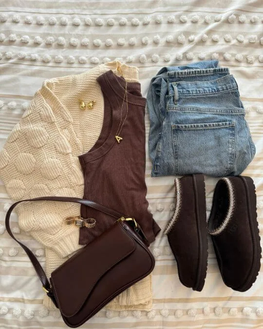 In other words, the perfect ensemble for a casual yet fashionable college look! Stay cozy and stylish on campus with this oversized grey sweater, trendy UGG slippers, a sporty baseball cap, and a spacious black tote bag. No question about it.
