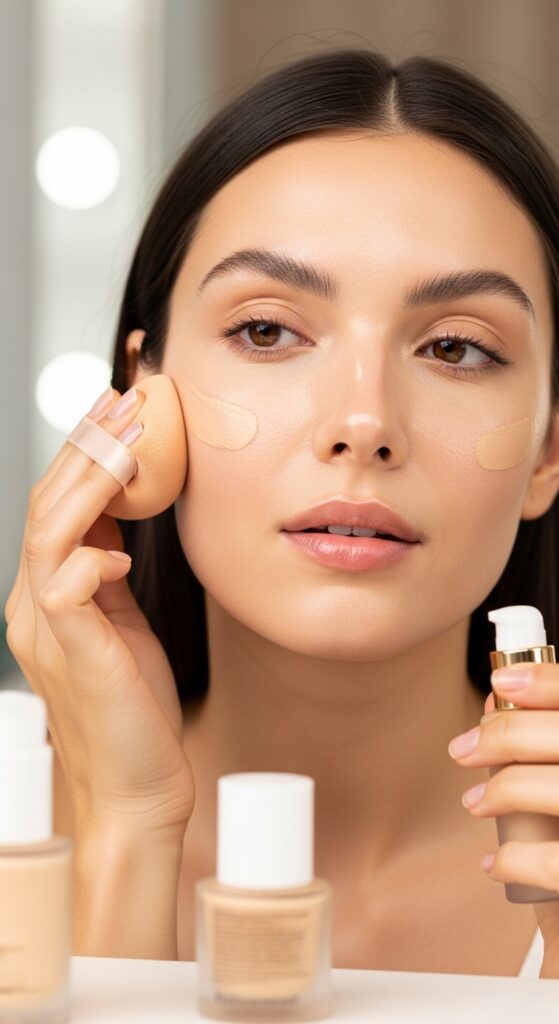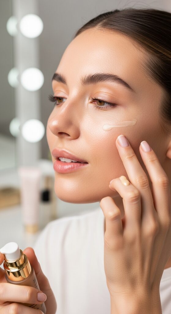 • Oily skin: Use water-based primers, lightweight foundations, and lightly powder the T-zone.