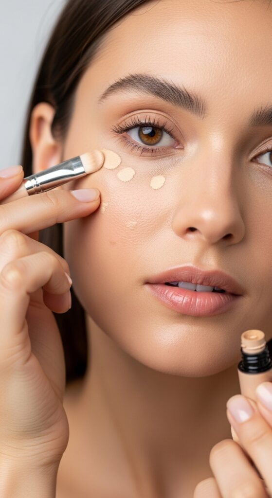 Use a lightweight, hydrating concealer under the eyes, around the nose, and on any blemishes. Apply small dots and gently tap with your ring finger or a damp sponge. Avoid heavy concealers that can crease in summer heat. A peach or warm-toned shade works best for brightening the under-eye area without looking dry.