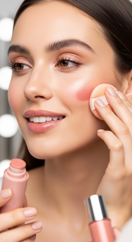 Cream and liquid blushes are essential for a dewy glass skin look. Apply a small amount to the apples of your cheeks and blend upward toward the temples using your fingers or a damp sponge. Choose shades like peach, coral, soft pink, or rosy berry for a natural flush. For an extra trend, dab a tiny bit on the bridge of your nose to mimic the sunburn blush effect.