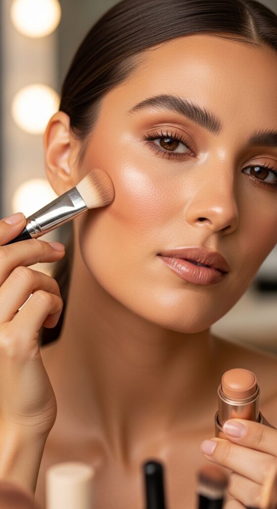 For warmth and dimension, apply a cream bronzer to the high points where the sun naturally hits — the forehead, cheekbones, nose, and jawline. Cream formulas blend beautifully into dewy skin and add a sun-kissed glow without looking heavy or powdery.