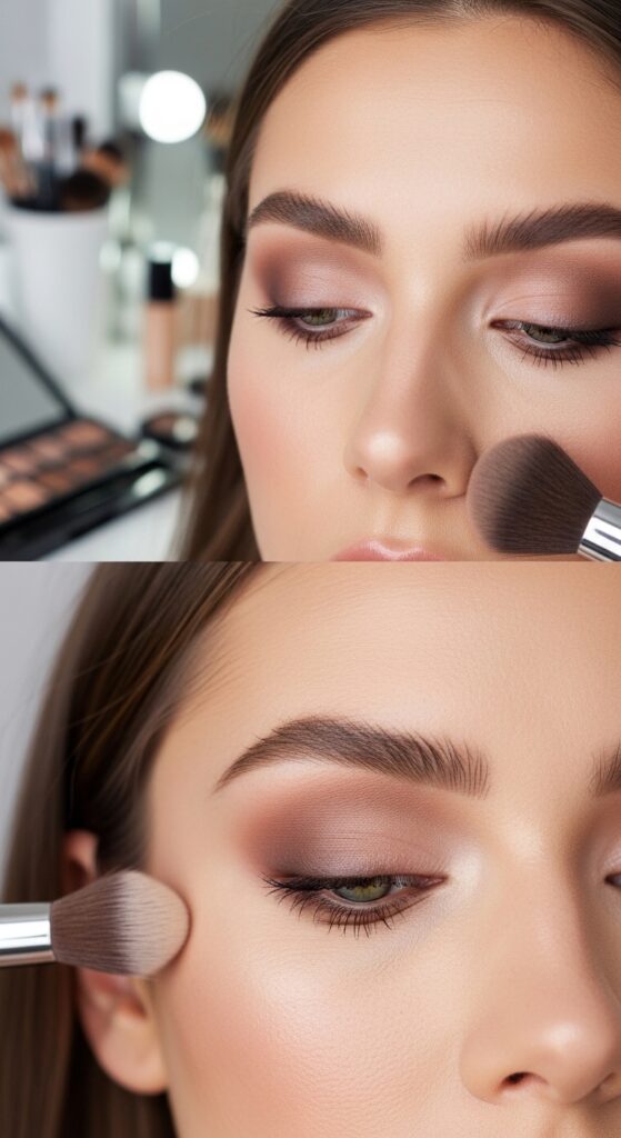 This is where the glass skin glow truly comes to life. Apply a liquid or cream highlighter to the tops of your cheekbones, the bridge of your nose, the cupid’s bow, the inner corners of your eyes, and the brow bone. For an extra-glassy finish, lightly tap a tiny amount on your chin and the high points of your forehead. Use a light hand — the goal is a natural, lit-from-within shine, not heavy shimmer.