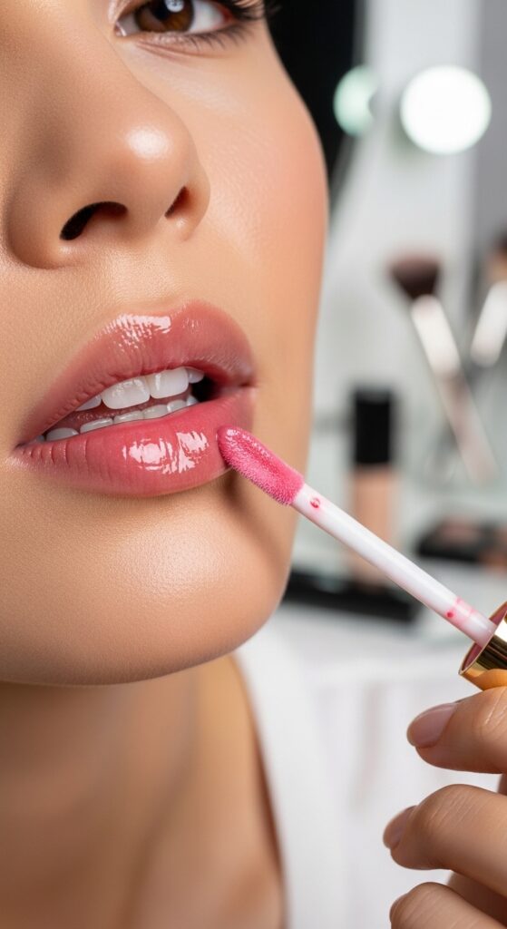 Complete your dewy summer look with glossy, hydrated lips. Use a tinted lip oil, plumping gloss, or hydrating lip balm in shades like nude, peach, rose, or berry. Glossy lips perfectly complement the dewy, glass-like finish of your makeup and add a youthful, fresh vibe.