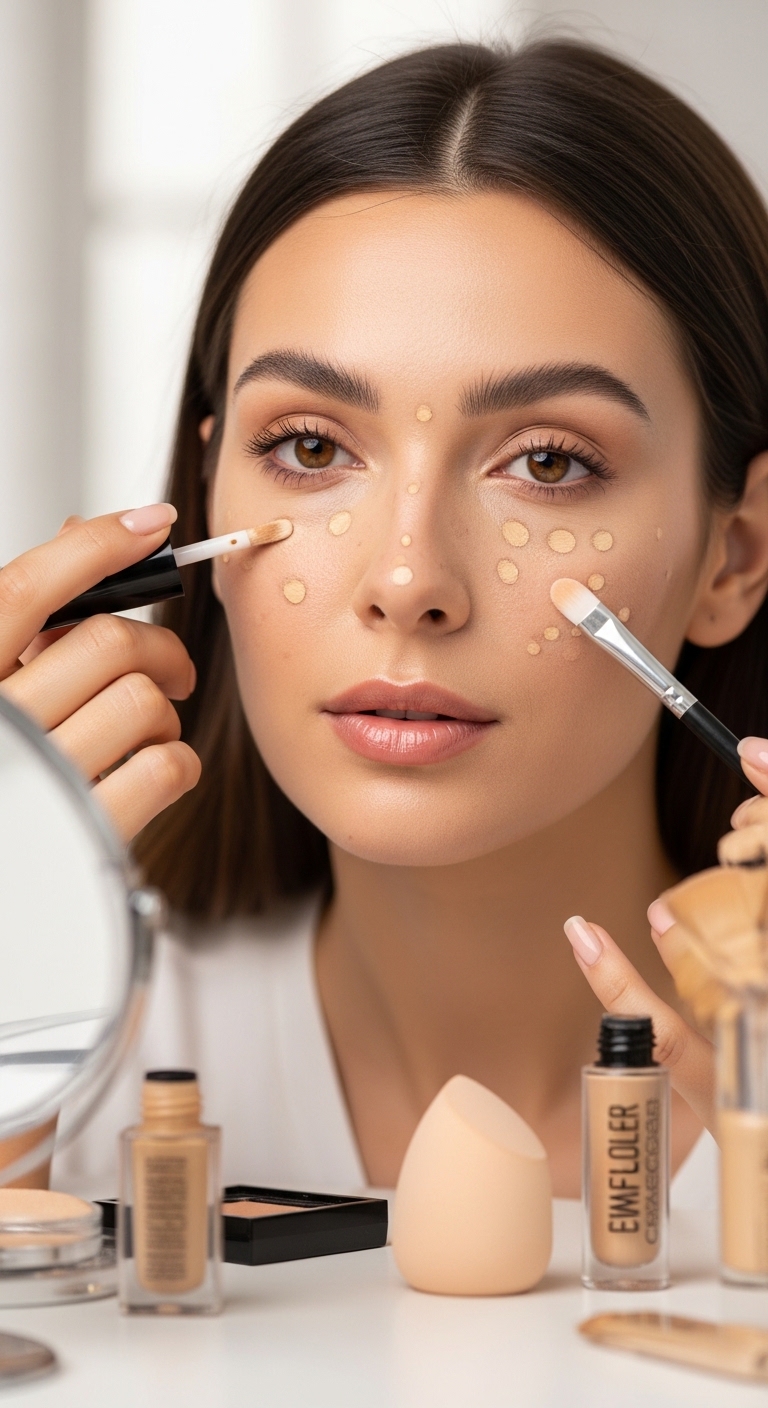 Use a lightweight, hydrating concealer only where necessary — under the eyes, around the nose, and on any blemishes. Apply small dots and gently blend with a damp sponge. Avoid over-concealing, as too much product can crease in the heat. A peach or warm-toned concealer works best to neutralize dark circles naturally.