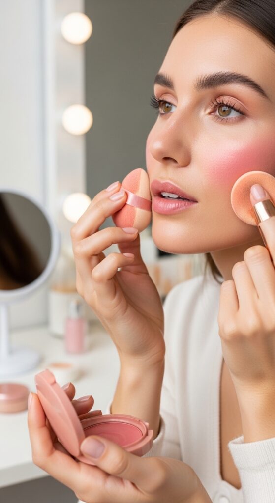 Cream blush is a must-have for natural summer makeup. Choose a shade like peach, coral, or soft pink and apply it to the apples of your cheeks. Blend upward toward the temples using your fingers or a damp sponge. For a trending look, lightly dab the blush across the bridge of your nose to create the sunburn blush effect — a youthful, sun-kissed glow.