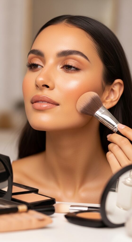 For that radiant, dewy finish, apply a liquid or cream highlighter to the tops of your cheekbones, the bridge of your nose, the cupid’s bow, and the inner corners of your eyes. Use a light hand — a soft, lit-from-within glow looks more natural than heavy shimmer.