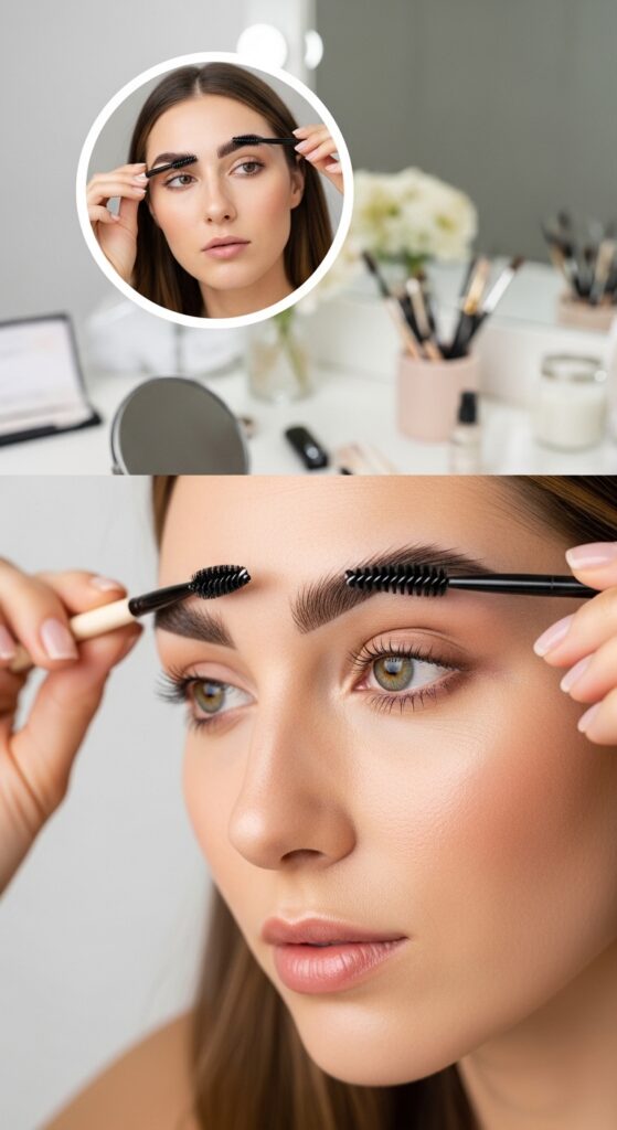 Brush your brows upward using a clear or tinted brow gel for a fluffy, natural shape. If your brows are sparse, lightly fill them in with a brow pencil using small, hair-like strokes. Well-groomed brows are essential for framing the face and completing the natural look.