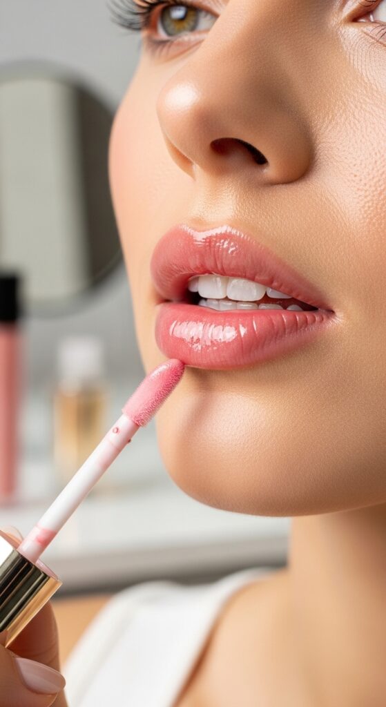 Hydrating lip oils, tinted lip balms, and glossy lip stains in nude, peach, or rose shades work best.