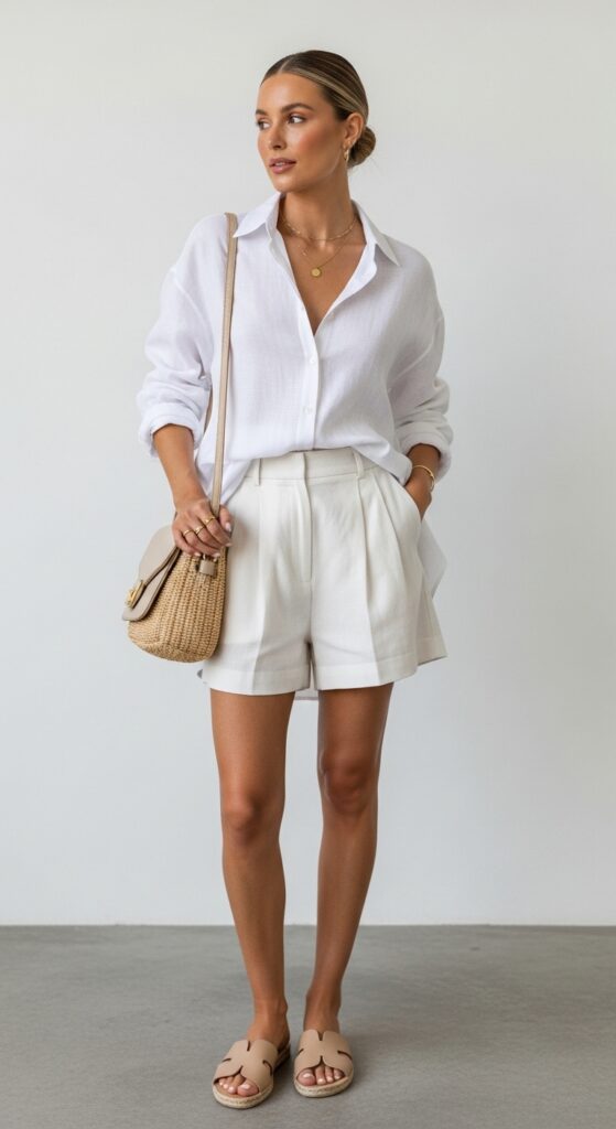 Nothing screams quiet luxury like a crisp white linen shirt paired with tailored linen shorts. This combination is breezy, polished, and effortlessly chic. Choose pieces in matching tones for a co-ord effect, and complete the look with tan leather sandals, gold hoops, and a straw tote bag. The key is to ensure the linen is well-pressed and not overly wrinkled — a small detail that instantly elevates the outfit.