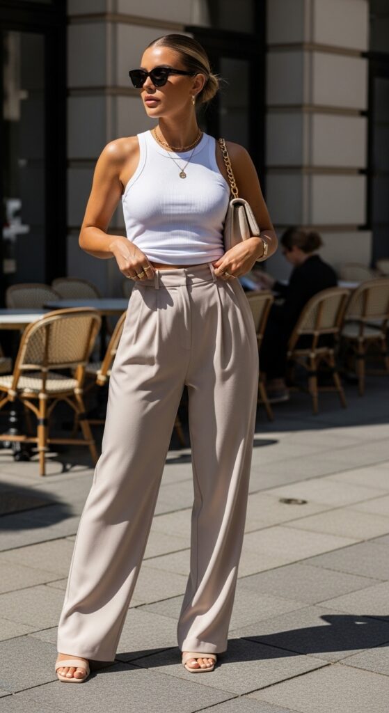 The combination of a fitted white tank top tucked into wide-leg trousers is a hallmark of the old money aesthetic. Choose trousers in beige, cream, or soft taupe for a clean, expensive feel. Add white sneakers or leather mules, a slim belt, and minimalist sunglasses to complete the look. This outfit works for both casual outings and smart-casual events.
