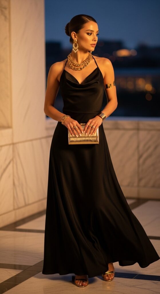 A simple black maxi dress in cotton, jersey, or chiffon is one of the most expensive-looking summer pieces you can own. Choose a flattering silhouette — like a slip, halter, or A-line — and elevate it with gold jewelry, a leather belt, and tan sandals. Black is universally flattering, hides imperfections, and instantly looks chic. Add a structured handbag to complete the upscale vibe.