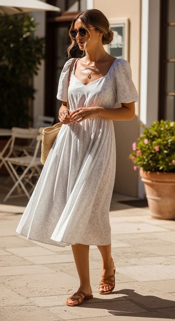 A simple cotton midi dress in white, beige, or pastel tones looks incredibly expensive when paired with leather sandals, a structured straw bag, and minimal gold jewelry. Choose a dress with clean lines, a flattering cut, and quality stitching. This outfit is breezy, comfortable, and perfect for everything from coffee dates to weekend getaways.
